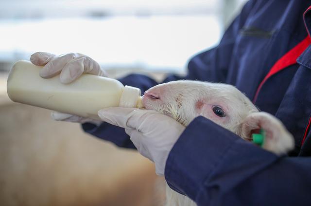 10月13日,工作人员在贵州省岑巩县龙田镇的申安湖羊养殖基地给羊羔喂奶。 新华社发(胡攀学 摄)