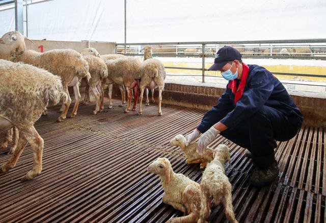 10月13日,工作人员在贵州省岑巩县龙田镇的申安湖羊养殖基地检查刚出生的羊羔健康情况。 新华社发(胡攀学 摄)