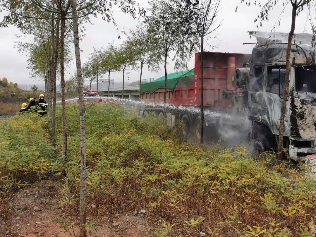 10月8日11时05分,隆德县消防救援大队接到119指挥中心报警称:隆德县陈靳乡往清凉村方向国道,一货车车头着火。接警后,竹林消防救援站出动4辆消防车、23名消防指战员赶赴现场紧急处置。
