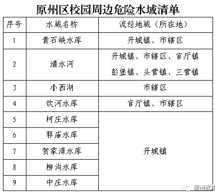 近日,固原市原州区教育体育局官方微信公众号,公布了原州区校园周边危险水域清单,为严防学生及幼儿溺水事故发生,请社会各界共同关注。