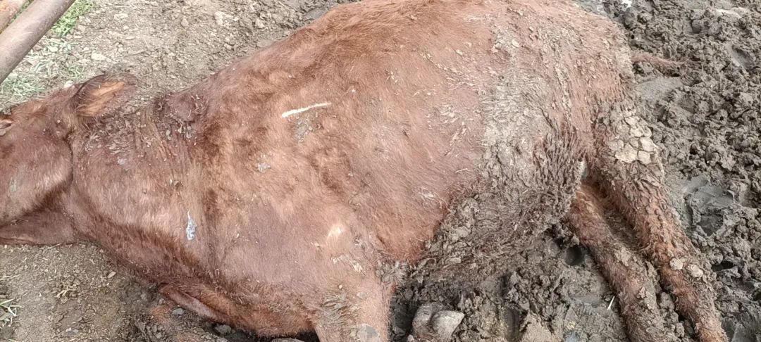 10月3日,王先生等雨停了,路好走一点,立马开车去养殖场清理牛粪和淤泥,这一去他才发现,有一头牛陷在泥泞中一动不动,“我走上前发现牛已经断气了,我推测可能是牛挣扎的时候鼻孔里呛进了泥,窒息而亡。”王先生很心痛,这头牛市场价在16000元左右,对他而言又是一笔不小的损失。
