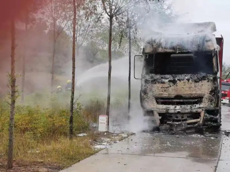 指挥员迅速下达作战命令:出双干线两支水枪灭火,一支水枪对明火进行扑救,防止火势蔓延全车,另一支水枪对该车辆油箱位置进行冷却,通过45分钟扑救,明火被完全扑灭。为防止死灰复燃,消防救援人员继续对整个车身进行冷却,所幸事故未造成人员伤亡。