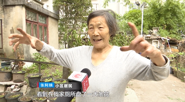 小区居民张阿姨:不知道什么时候爬出来的,半夜三点多钟我起来上厕所,看到在我家厕所盘了一大条蛇,有这么粗。