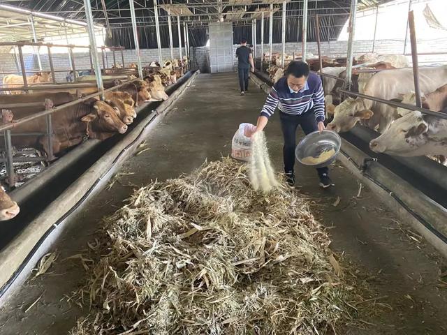 在琅环镇琅环村一组商品肉牛饲养基地内,一排排整洁干净的牛舍映入眼帘,一头头健硕的肉牛在牛舍里嚼食草料,工人们忙碌着清理牛舍、添加草料。