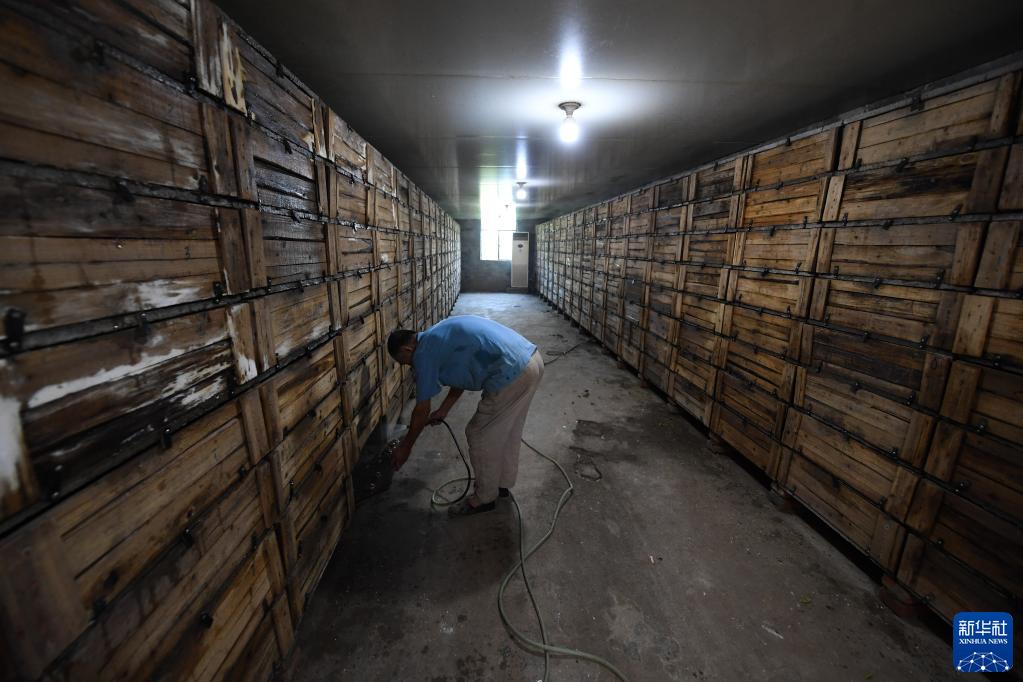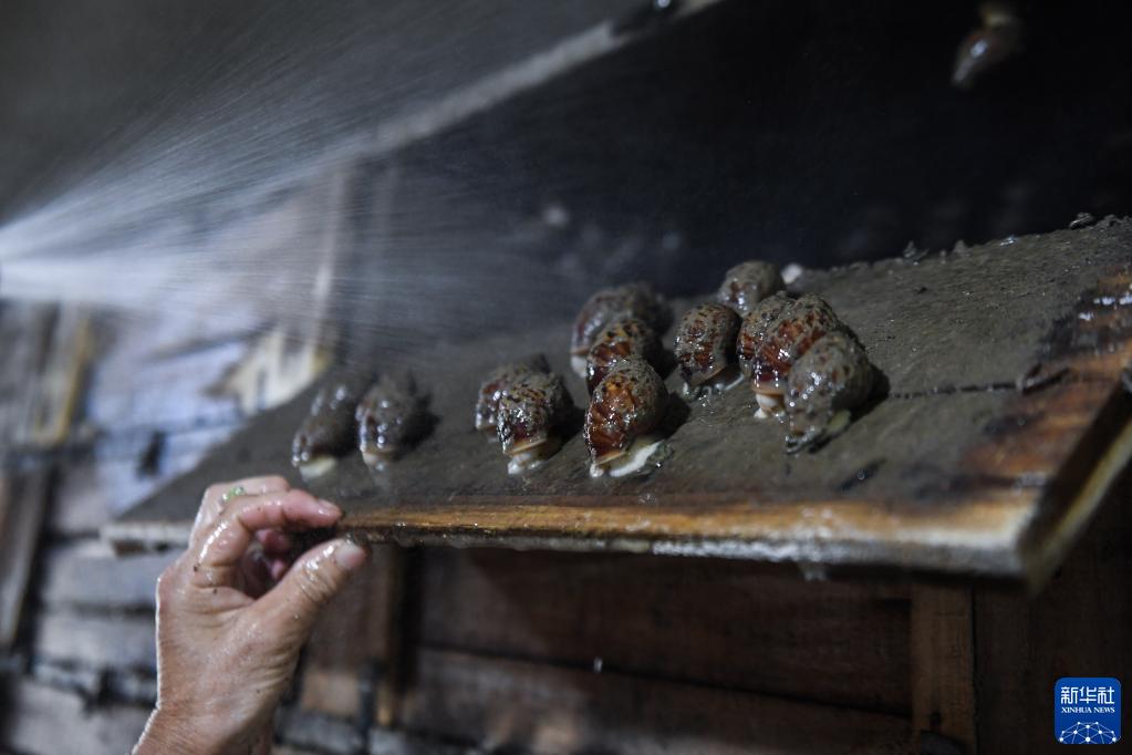 9月22日,嘉兴南湖区余新镇的一名蜗牛养殖户给养殖白玉蜗牛的抽屉喷水,保持湿度。
